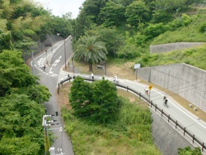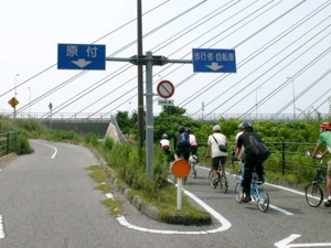 多々良大橋の上から撮影。自転車と原付の合流地点には必ず専用道路の案内があります。