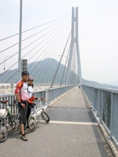 コース最後の橋、因島大橋です。この橋は上下二段構造になっていて、上がクルマで、下が自転車・歩行者に分かれています。橋のトラス構造からチラチラ見える景色も他と違って楽しかったです。