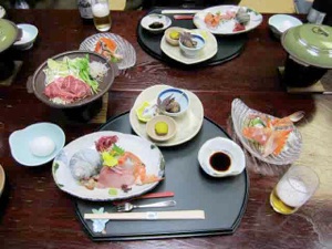まずはお造り盛り合わせ、カニ、牛すき焼きに小鉢が3種。