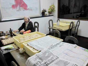 夕食も終えて、自転車を宿の中に入れようと移動していたら、明日のエイドステーションで配る『鯛おにぎり』と『エビおにぎり』がずらり。宿に着いた時にも既にたくさんのおにぎりが並べられていましたが、まだまだ掛かるみたいで…3000個って気が遠くなりますね。